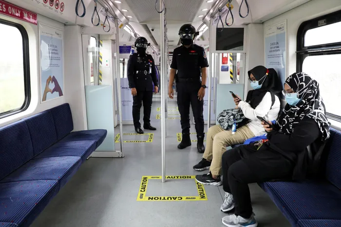 Auxiliary police officers wearing 'Smart Helmets', a portable thermoscanner that can measure the temperature of passengers at a distance, patrol inside a commuter train, amid the coronavirus disease outbreak in Kuala Lumpur, Malaysia. Picture: Lim Huey Teng/Reuters