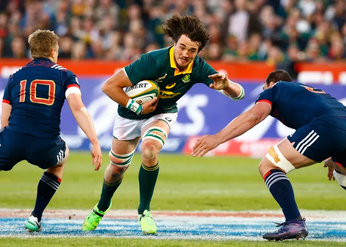 Franco Mostert runs at a gap between two French players. Photo: EPA/Kim Ludbrook Franco Mostert runs at a gap between two French players. Photo: EPA/Kim Ludbrook