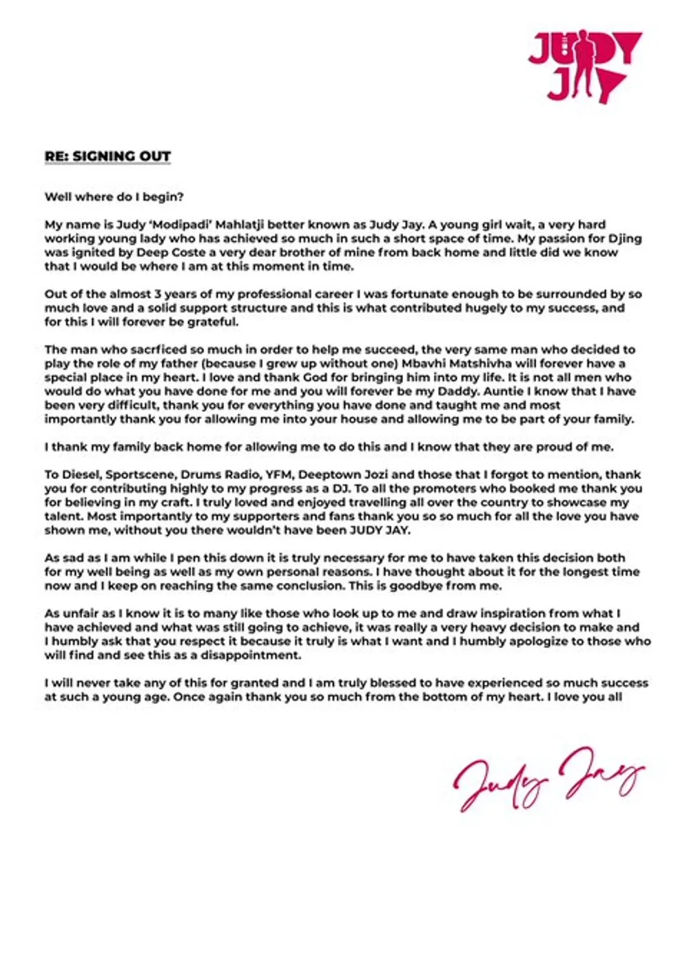 On Monday morning, Jay, whose real name is Judy Mahlatji, released a statement to announce her exit as a DJ.