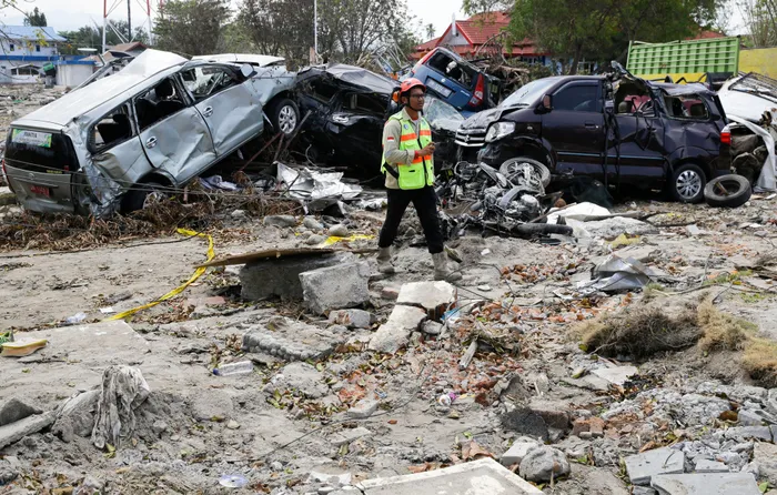 A man walks past remains of cars that were destroyed in the massive earthquake and tsunami that hit Palu, Central Sulawesi, Indonesia Thursday, Oct. 4, 2018. Life is on hold for thousands living in tents and shelters in the Indonesian city hit by a powerful earthquake and tsunami, unsure when they'll be able to rebuild and spending hours each day often futilely trying to secure necessities such as fuel for generators. (AP Photo/Aaron Favila) A man walks past remains of cars that were destroyed in the massive earthquake and tsunami that hit Palu, Central Sulawesi, Indonesia Thursday, Oct. 4, 2018. Life is on hold for thousands living in tents and shelters in the Indonesian city hit by a powerful earthquake and tsunami, unsure when they'll be able to rebuild and spending hours each day often futilely trying to secure necessities such as fuel for generators. (AP Photo/Aaron Favila)