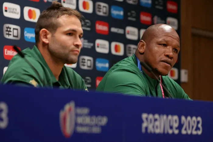 South Africa’s starting scrumhalf Cobus Reinach and hooker Bongi Mbonambi at a press conference in Croissy-sur-Seine, near Paris, this week ahead of the Rugby 2023 World Cup quarter final against France tomorrow. Picture: Thomas SAMSON / AFP)