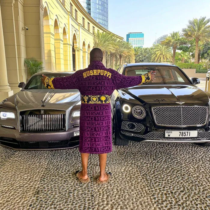 Ramon Olorunwa Abbas aka Hushpuppi, outside his Dubai residence, in front of two of his 13 luxury vehicles, while wearing a monogrammed Versace bathrobe. PICTURE: Instagram