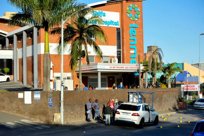 The shooting incident on Thursday afternoon took place outside a hospital in Sydenham, Durban. The occupant of a white Mercedes was killed. Police were called out to a shooting in Sydenham outside the Lenmed Shifa Private Hospital in Durban on Thursday. A man was killed. Picture: Theo Jeptha African News Agency (ANA)