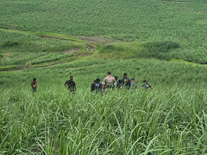 People walking in a field with long grass or vegetation The body of a three-year-old bot was recovered in oThongathi after his step-father attacked his seven-year-old brother with a panga Picture: IPSS Search and Rescue