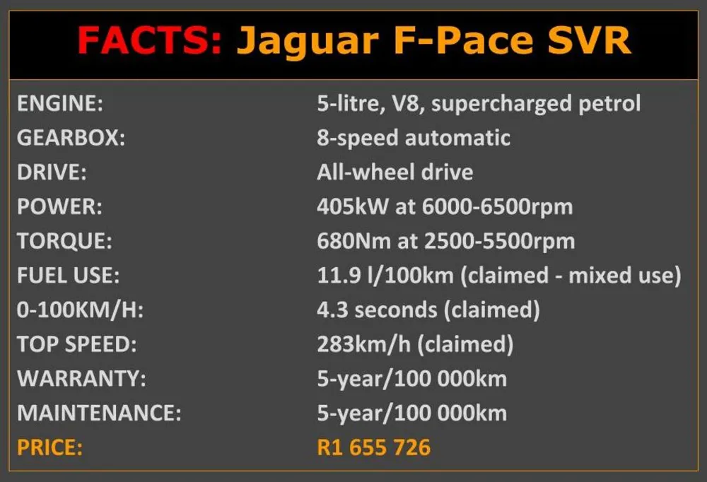 Priced at R1.65 million the Jaguar F-Pace SVR is only a few grand more expensive than that aforementioned Munich rival, which costs R1.64m, and it’s a good 220 grand less expensive than the Mercedes-AMG GLC 63 AMG 4Matic+.