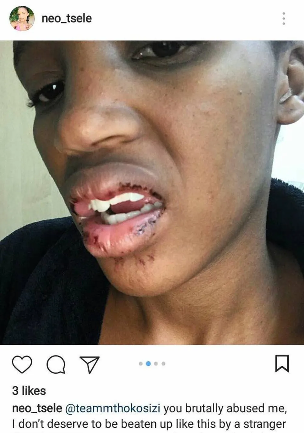 Neo Tsele posted images of her bruised and bloodied face on Instagram. Picture: Instagram