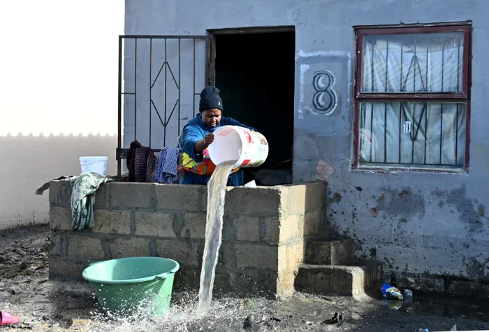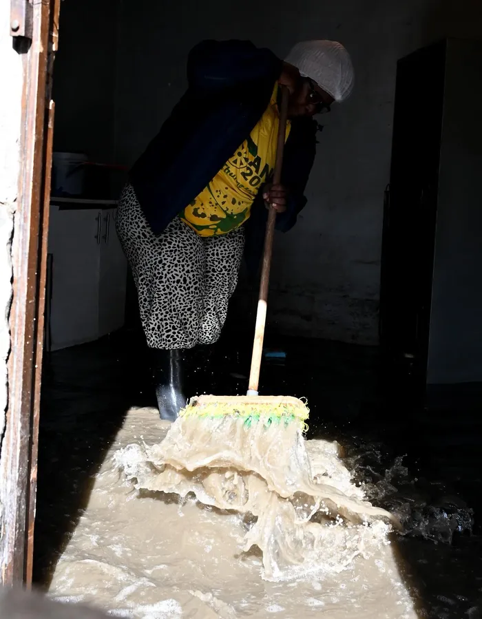 Thandi Velem, from the Dunoon informal settlement, sweeps volumes of water outside her home.