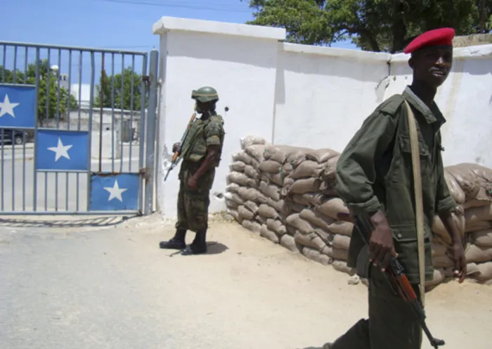An African Union peacekeeper from Uganda and a Somali government soldier guard the presidential palace in the Somali capital, Mogadishu. Two of the city's Islamist groups have joined forces. An African Union peacekeeper from Uganda and a Somali government soldier guard the presidential palace in the Somali capital, Mogadishu. Two of the city's Islamist groups have joined forces.