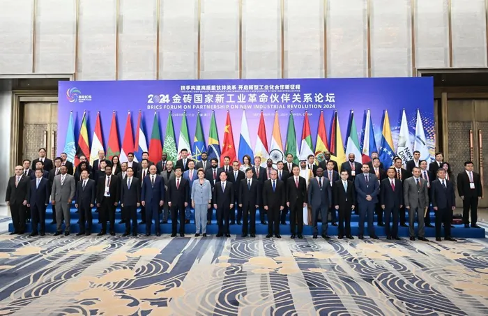 Participants of BRICS Forum on Partnership on New Industrial Revolution 2024 pose for a group photo in Xiamen, southeast China's Fujian Province.
