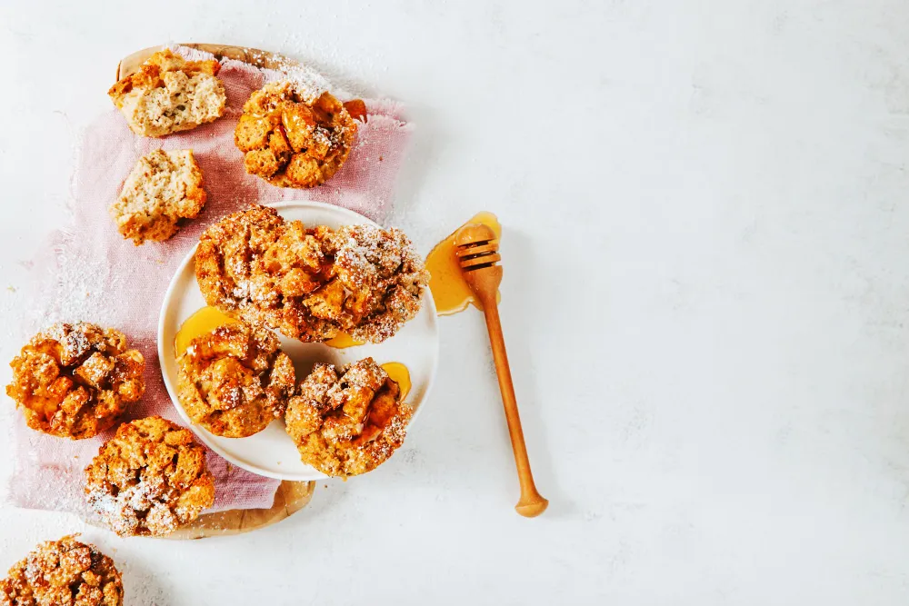 Preheat the oven to 180°C. Grease a mun tin with butter. In a large bowl, whisk together the eggs, milk, cinnamon, sugar, and vanilla extract. Add cubed bread to the mixture and fold until combined, and all of the liquid is absorbed. Divide the bread mixture into mun tins, pressing it lightly into each cup to compact it. Bake for 25 to 30 minutes. Allow to cool for 5 minutes, scoop out, and serve topped with golden syrup.