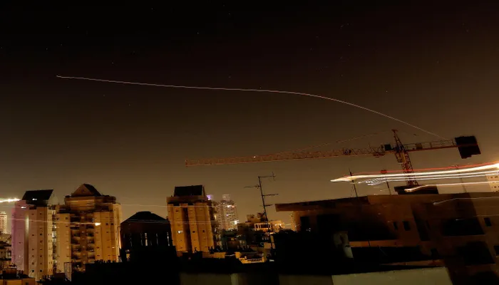 Rocket trails are seen in the sky amid a fresh barrage of Iranian missile attacks, above the Israeli coastal city of Netanya, on March 17.