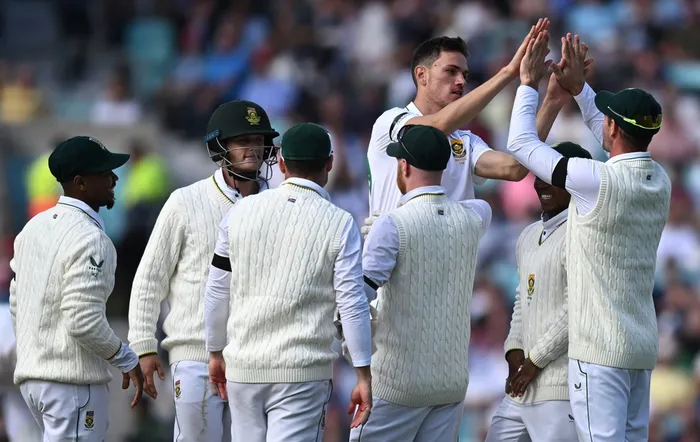 South Africa's Marco Jansen celebrates with teammates after the dismissal of England's Alex Lees during play on the third day of the third Test match at The Oval in London on Saturday South Africa's Marco Jansen celebrates with teammates after the dismissal of England's Alex Lees on the third day of the third Test match at The Oval in London on Saturday. Photo: Ben Stansall/AFP