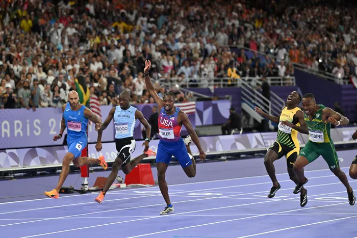 The United States’ Noah Lyles crosses the finish line ahead of South Africa's Akani Simbine, right, in the men's 100m final at the Paris Olympic Games. The United States’ Noah Lyles crosses the finish line ahead of South Africa's Akani Simbine, right, in the men's 100m final at the Paris Olympic Games. Picture: Andrej Isakovic / AFP